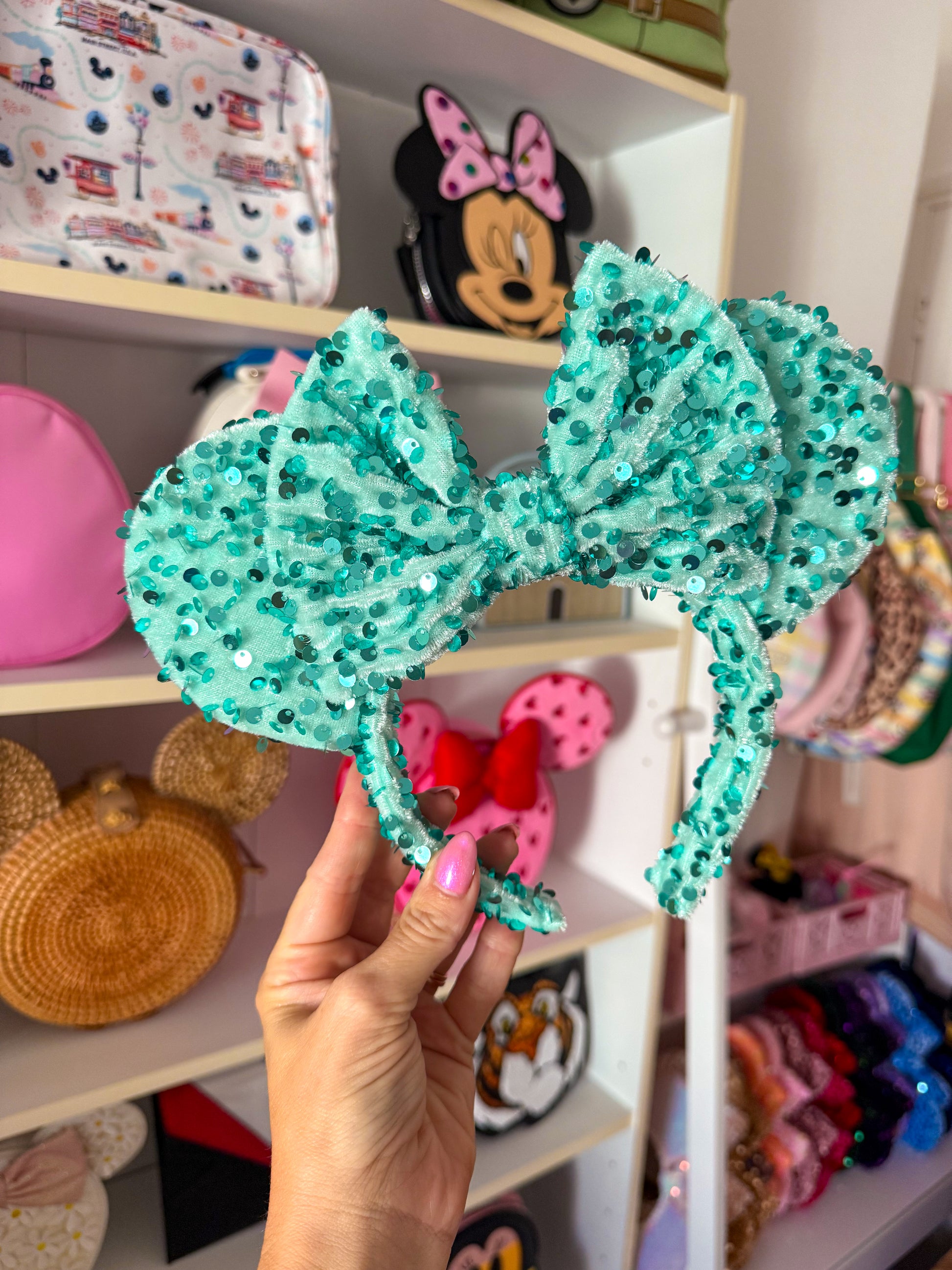 These Mint Sparkle Luxury Sequin Ears are ideal for any Disney-inspired occasion, be it a trip to the Disney Parks, a meet with characters such as Cinderella, Donald Duck with all the sparkles, or simply bringing a touch of Disney magic into daily life. Made by Ears Ever After.