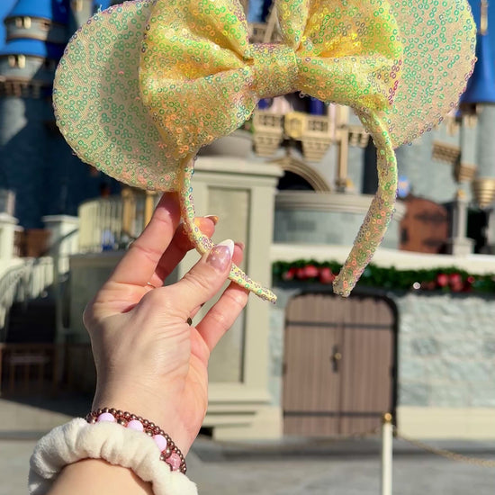 These Butter Yellow Iridescent Sequin Ears are ideal for any Disney-inspired occasion, be it a trip to the Disney Parks, a meet with Minnie and Mickey Mouse, or simply bringing a touch of Disney magic into daily life. Made by Ears Ever After.