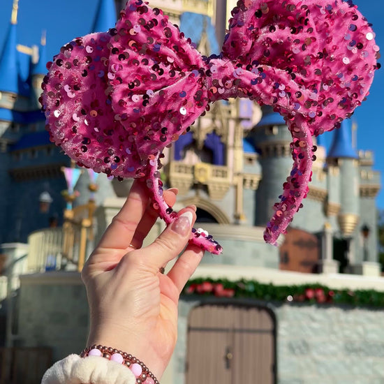 These Pink Sparkle Luxury Sequin Ears are ideal for any Disney-inspired occasion, be it a trip to the Disney Parks, a meet with characters with all the sparkles, or simply bringing a touch of Disney magic into daily life. Made by Ears Ever After.